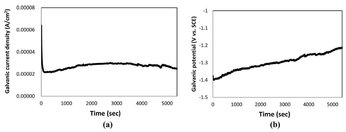Measurements of the variation in (a) galvanic current density and (b) galvanic potential