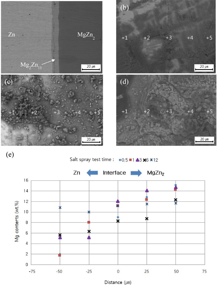 대한 구동력이 존재하여 전류 값이 측정될 것으로 예상할 수 있다. 이는 두 소재를 도선으로 연결하여 갈바닉 부식실험을 수행한 결과 (그림 5)로 확인되었다. 구체적으로, 갈바닉 전위가 MgZn2의 부식 전위인 대략 -1.4VSCE에서 증가되었고 Zn 시편 쪽에서 MgZn2 시편 방향으로 갈바닉 전류의 흐름 (MgZn2 시편-작업전극, Zn 시편-기준전극 및 접지 연결하여 + 방향 전류 값 도출되어 MgZn2에서 Zn 시편으로 전자흐름)이 확인되었다. Zn와 MgZn2 시편 각각 의 부식전위 및 갈바닉 부식전류 값 도출 이외에 두 시편을 열간접합하여 제작한 Zn-MgZn2 공정조직 확대모사 시편을 대상으로 수행한 SST를 통해서도, 유사한 거동의 실험결과가 도출되었다. 그림 6(a)에는 SST 전, 접합부 계면의 형상을 보여주며, 고온접합과정 중 확산으로 인해 대략 5 μm 두께의 Mg2Zn11이 추가로 형성되었음을 알 수 있다. SST 후 표면형상관찰 (그림 6(b)-(d)), 및 EDS를 통한 Mg 성분 분석결과 (그림 6(e)), MgZn2 영역 뿐 아니라 Zn 영역 상부에서도 Mg 함량이 검출되었음을 토대로, 부식반응 초기 전기화학적으로 보다 활성인 MgZn2가 우선 용출되어 공급된 Mg 및 Zn 이온이 산소가 포함된 수용액 및 Cl 이온 등과 반응하여 Mg을 포함한 부식생성물의 형태로 인근영역인 Zn