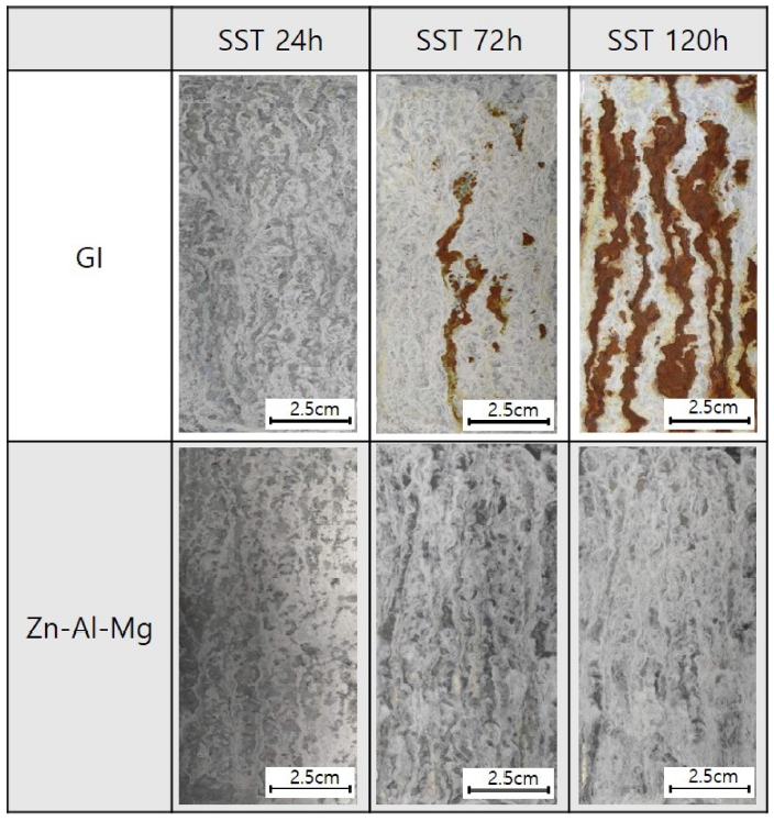 우선, 아연도금강재 (GI)과 합금도금강재 (PosMAC), 두 가지 상용도금강재의 내식성 차이를 비교하기 위해 SST를 수행하였고, 그림 7에 표면 형상 결과를 나타내었다. 많은 선행연구결과와 마찬가지로 Zn 기반 도금층 내, 소량의 Al 및 Mg의 첨가는 표면 적녹의 발생량을 현저히