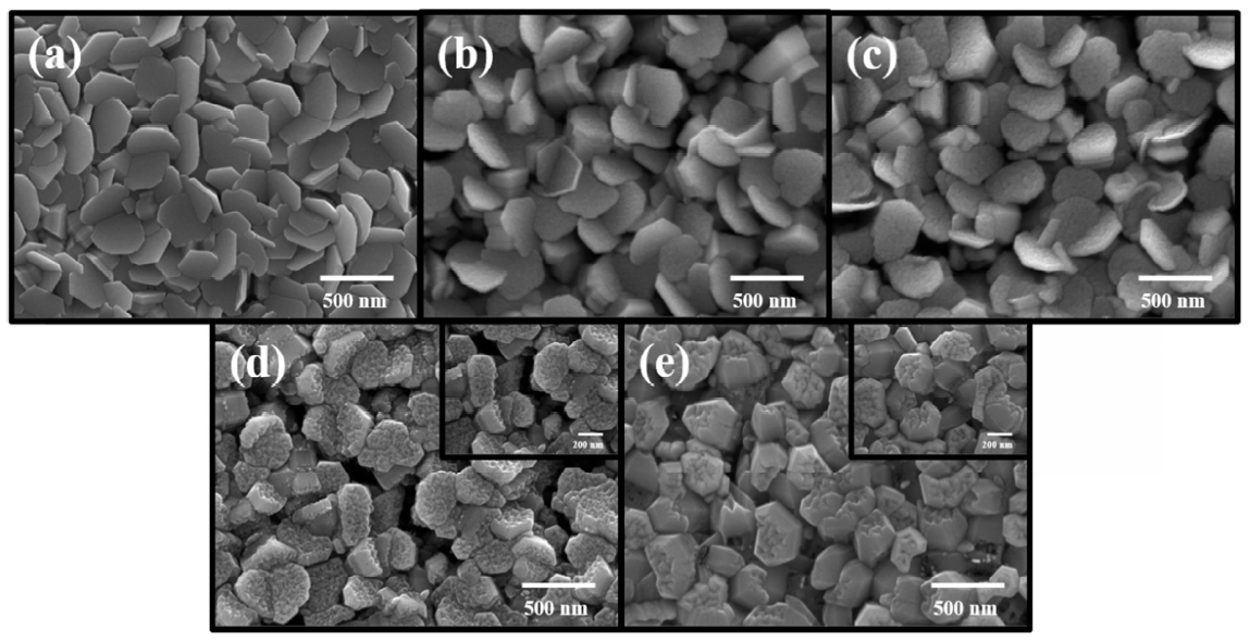 Fig 2 (d) and (e), respectively. In the case of ZnO thin film oxidized at 70 °C, Zn2+ ions, which were ionized from the side surfaces of the Zn plates, combined with OH- ions, and numerous nano-scale ZnO islands were randomly formed on the plate surfaces,