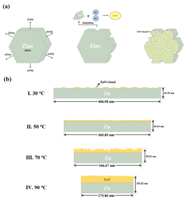 decreased from approximately 406.98 nm (30 °C) to 275.86 nm (90 °C) because Zn2+ ions were released from the side surfaces of the Zn. Meanwhile, the average thickness