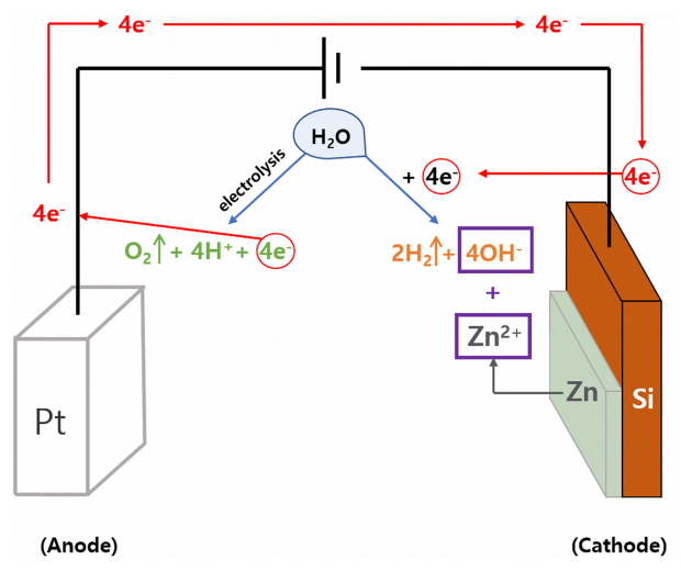 of OH- ions (Eq. (7)). A large amount of OH- ions immediately combines with Zn2+ ions captured near the cathode, forming Zn(OH)2, and ZnO is produced by the thermal decomposition of Zn(OH)2 (Eqs. (8) and (9)) [30]. Therefore, when the Zn film was oxidized using the ECO method, ZnO rapidly formed