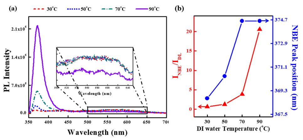 NBE emission to that of the DL emission peak (INBE/IDL) in the ZnO thin film was plotted as a function of the DI water temperature, in order