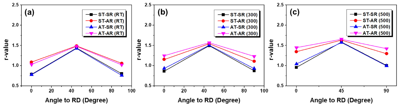 rolling direction for the rolled specimens at RT(a), 300 °C(b), and 500 °C(c).