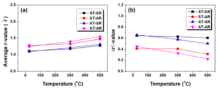 ) (a) and |Δr|-value (b) as a function of rolling temperature.