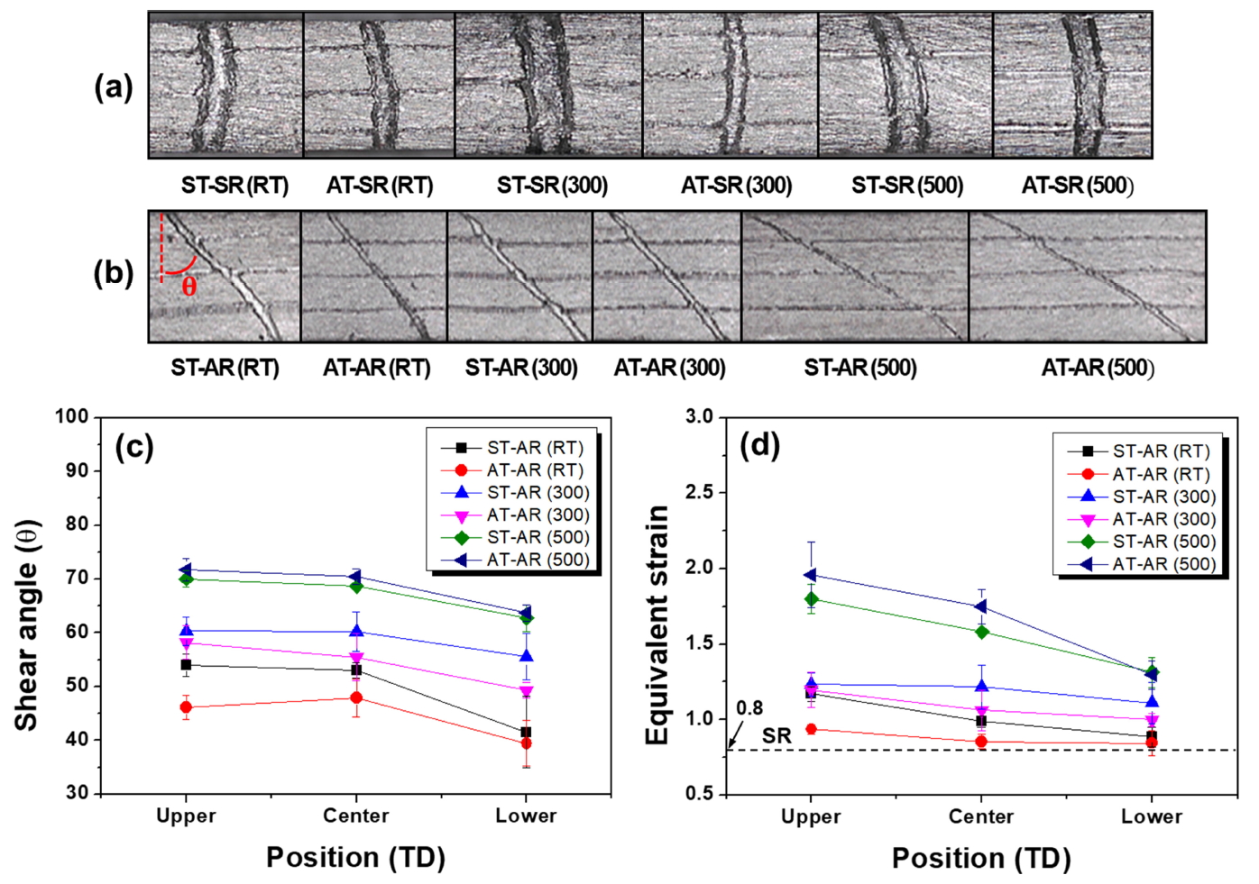 증가함을 알 수 있다. 그림 5(b)로부터 시편의 상부, 중부, 하부에서 전단각을 측정하였으며 그 결과를 그림 5(c)에 나타내었다. 또한 그림 5(c)의 전단각과 식(2)를 이용하여 등가변형률을 계산하였으며 그 결과를 그림 5(d)에 나타내었다. 식(2)에서 알 수 있는 것과 같이 등가변형률은 전단각 이외에 수직변형률 (εx, εy)에 의해서도 좌우되지만 모든 시편에 대해 압하율이 50%로 동일하며 그림 5(b)에서 알 수 있는 것과 같이 비대칭압연 시 각 시편에서의 그리드 두께 차이가 크지 않아 수직변형률의 차이가 작기 때문에 그림 5(c), (d)에서 알 수 있는 바와 같이 전단각과 등가변형률의 변화양상은 비슷함을 알 수 있다. 한편 그림 5(c), (d)에서 알 수 있는 바와 같이 시편의 상부에서 큰 전단각과 큰 등가변형률을 보여주는데 이는 하부롤보다 빠른 롤의 회전속도에 기인한다. 또한 압연온도가