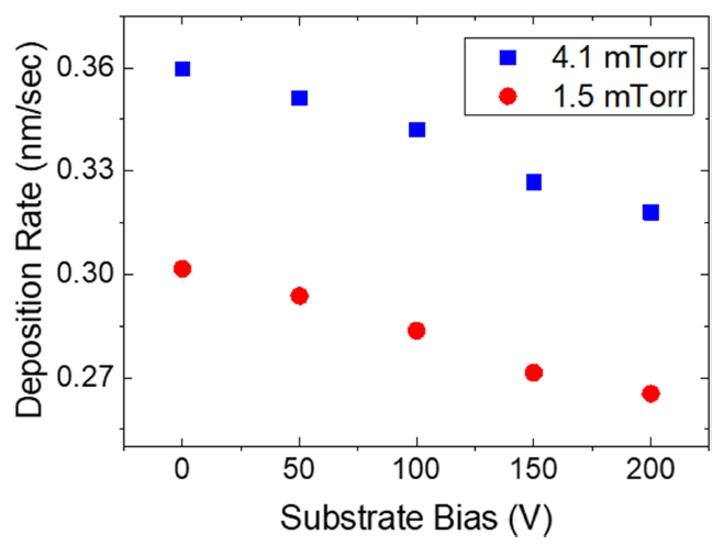 0.42 A/490 V와 0.31 A/650 V이었다. 4.1 mTorr에서의 높은 증착률은 높은 스퍼터링 전류, 즉 타겟과 충돌하는 Ar+의 개수에 비례하여 증가하는 것으로 해석할 수 있다. 또한 기판 바이어스의 증가로 인해 기판에 충돌하는 Ar+의 개수 및 에너지 증가로 인해 증착률이 점점 하락하는 경향을 보이게 된다.