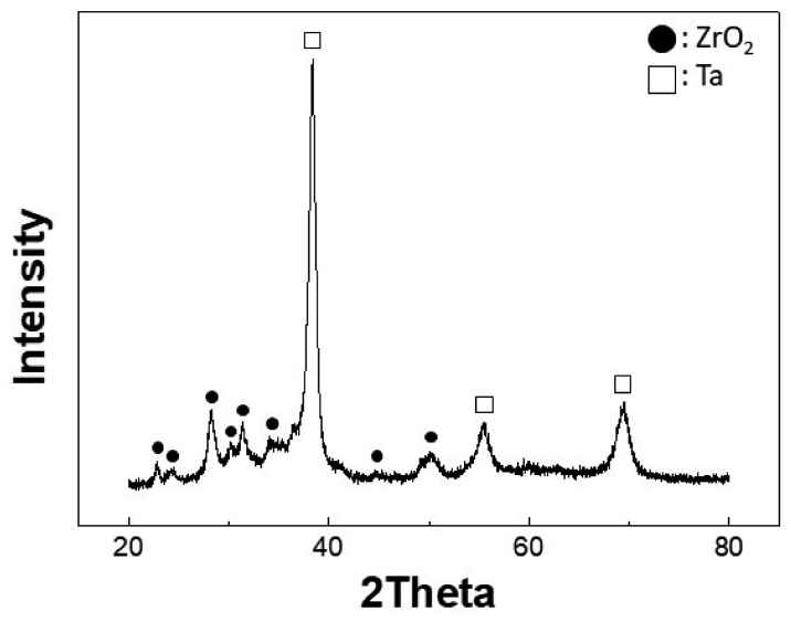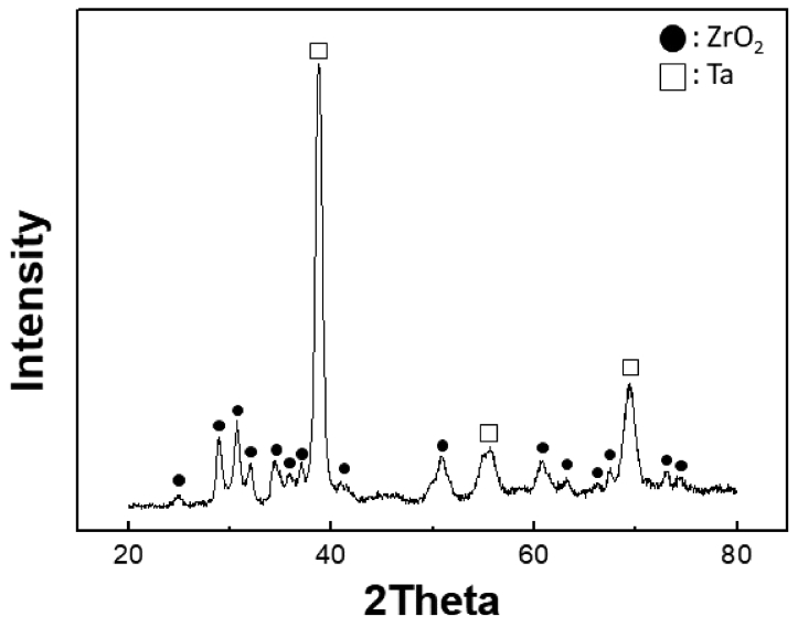 그림 6은 밀링한 분말을 펄스전류활성 소결 장치로 1350 °C에서 소결한 시편의 X-선 회절 시험 결과를 나타낸 것이다. X-선 회절도형에서 ZrO2 와 Ta 피크만 관찰되었다.