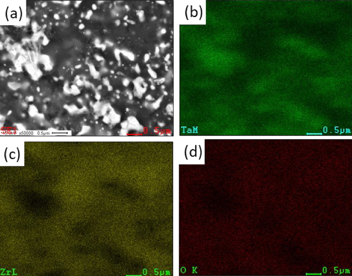 FE-SEM image and X-ray mapping analysis of the 2Ta-5/2 ZrO2 composite sintered at 1350 °C: (a) FE-SEM image, (b) Ta mapping, (c) Zr mapping,