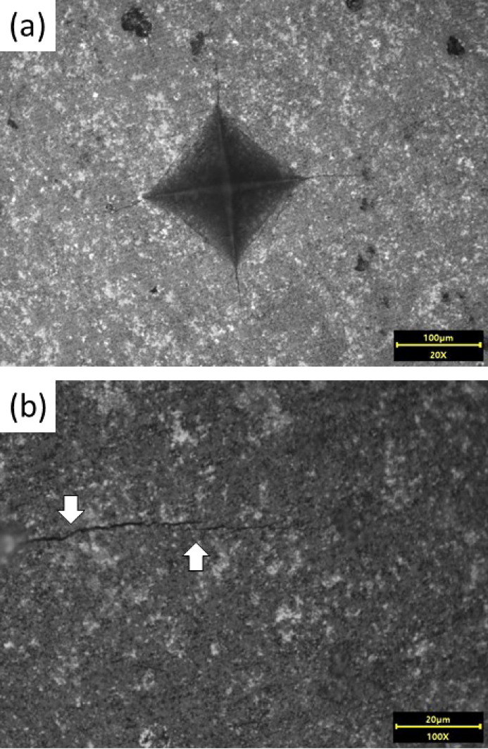 2Ta-2.5ZrO2 복합재료의 경도는 비커스 경도계 (하중 20 kg)로 평가하였다. 그림 9는 비커스 경도의 압흔 자국 (그림 9(a))과 균열의 전파 (그림 9(b))를 나타내었다. 압흔모서리에서 균열이 전파되기 시작하였다. 경도는 압흔의 면적을 계산하여 평가하였으며, 파괴인성은 압흔 모서리로부터 전파한 균열의