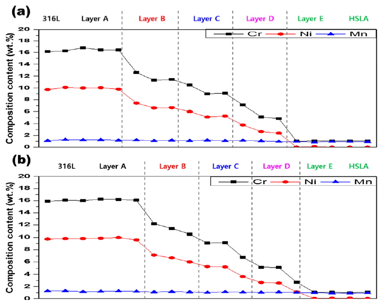 그림 1(a)는 DED로 적층한 적층물의 모식도로써 서로 다른 합금조성을 가지는 5개의 층을 보여준다. 각 층은 Type 316L 스테인리스강 (Stainless