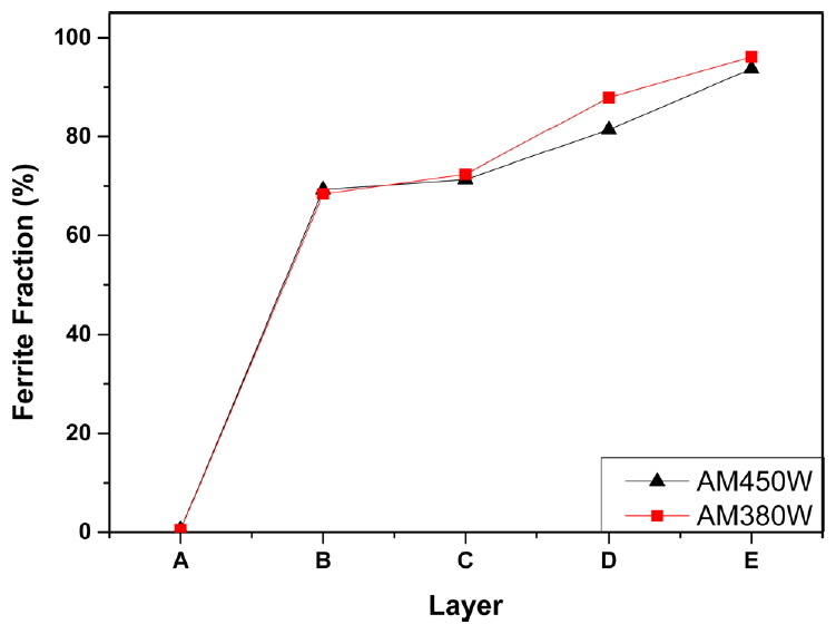 72.4% (AM380W)로 측정되었다. D층은 81.4% (AM450W)와 87.9% (AM380W)로 측정되어 두 시편간 5%이상의 페라이트 상분율