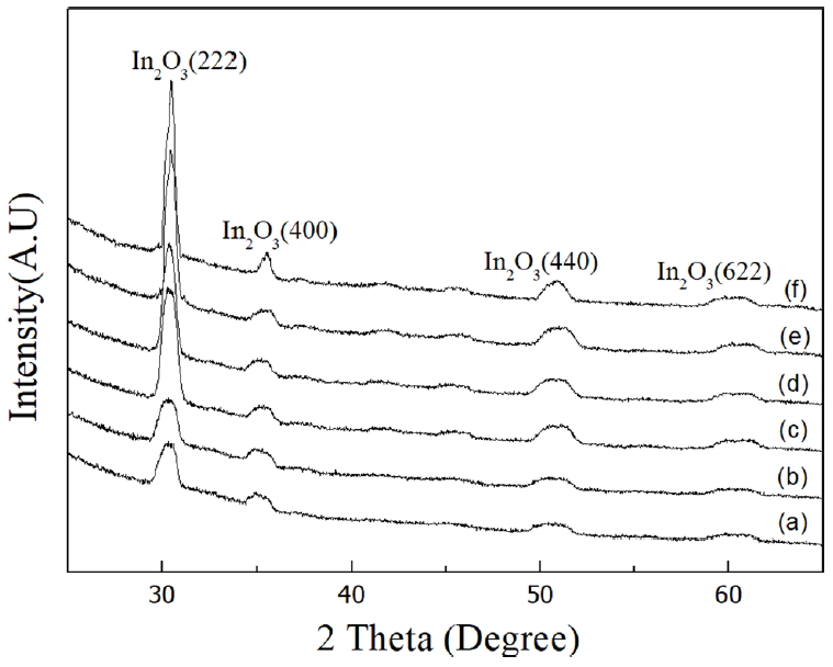 Various indium oxide (In2O3) films doped with metals such as molybdenum (Mo) [1, 2] titanium (Ti) [3], zirconium (Zr) [4], tungsten (W) [5], and niobium (Nb) [6] exhibit high visible transmittance (≥ 80%) and low resistivity (≤1×10-3cm), and have been applied in various optoelectrical devices including transparent