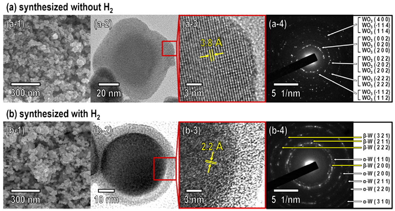 FESEM, HRTEM, and selected area electron diffraction (SAED), as shown in Fig 4. The WO3 powder synthesized without H2 consisted of nanoparticles with a particle size (d50) of 22.10 nm; the nanoparticles