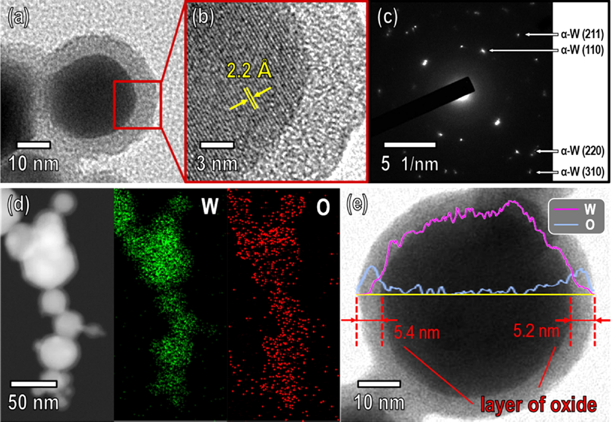 shown in Fig 7d and Fig 7e, verified that the nanopowder consisted only of the element W with an outer oxide