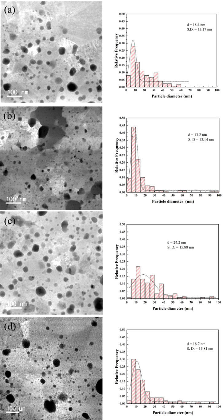 Figure 5 shows the TEM images and Y2O3 particle distribution of the (a) NCY-c and (b) NCY-h sintered at 850 °C, and the