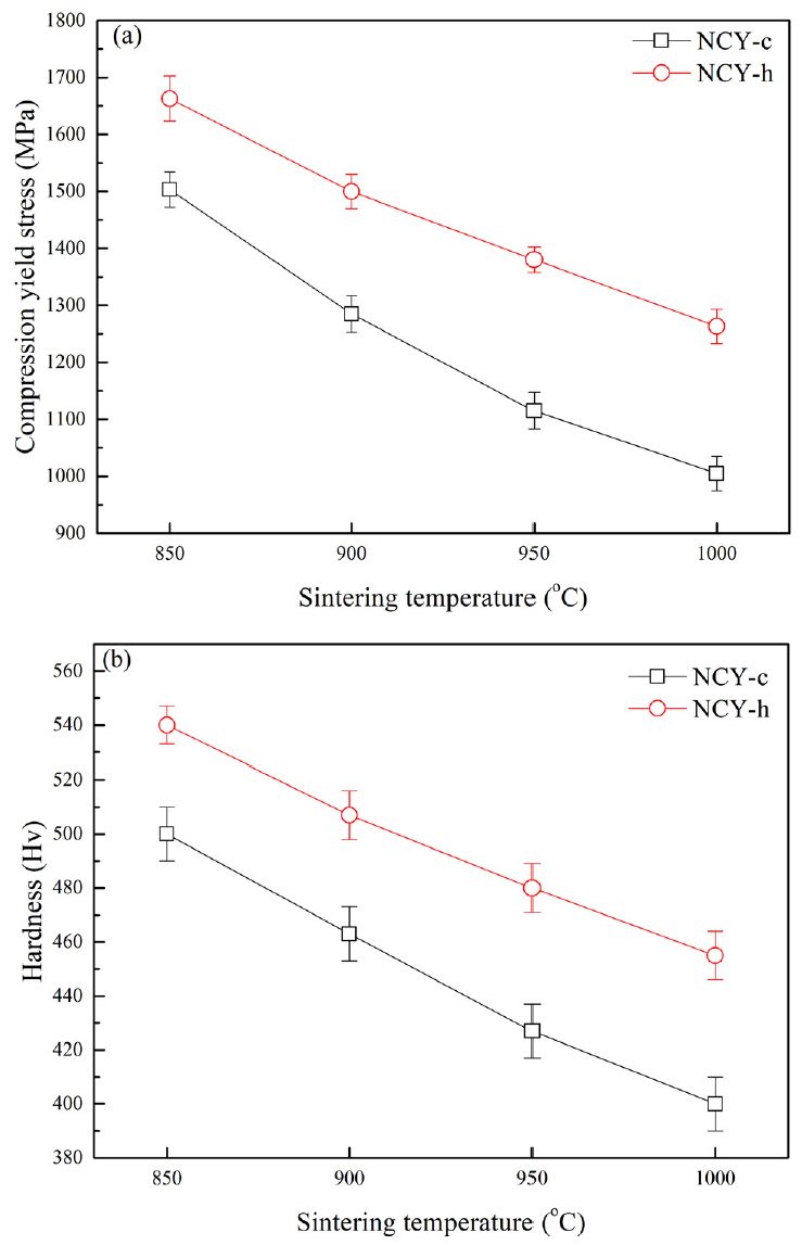 Figure 7 shows the (a) compression yield strength and (b) Vickers hardness of the sintered