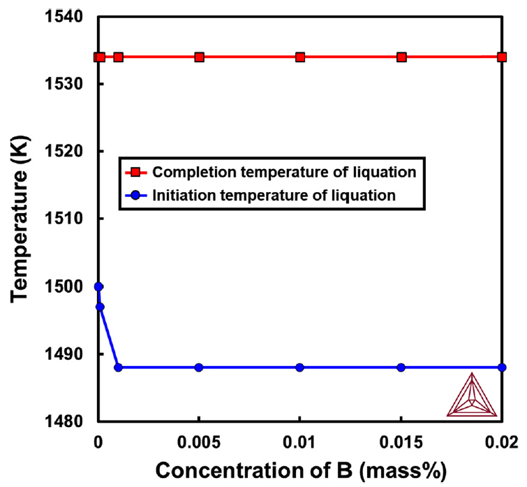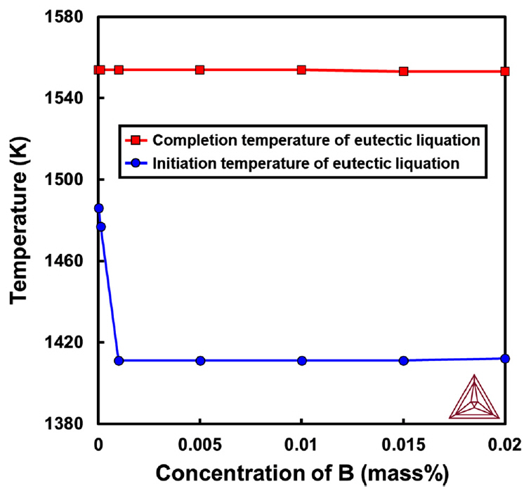 Relationship between eutectic liquation temperature range and B concentration calculated