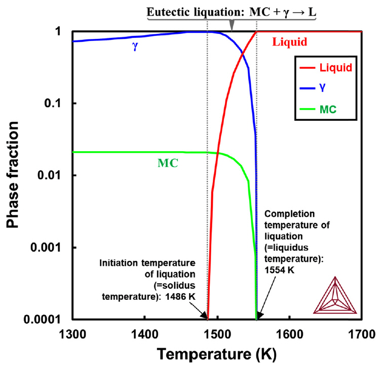 분율은 감소하고 액상 분율은 증가하는, 즉 MC+γ→L의 공정반응을 나타낸다. 즉 그림 11에서 설명한 공정반응 기반의 조성적 액화 현상이 액화 균열이 발생한 γ/MC 경계에 존재하는 것으로 확인되었으며, 그로 인해 용접 승온 시의 액화시작온도(=고상선