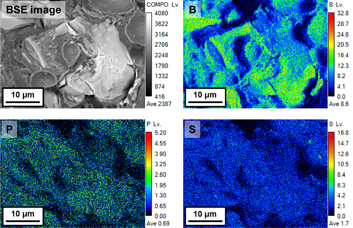 상당량의 저융점 액상을 형성시키는 것으로 알려져 있다 [10,29-31]. 그림 9는 그림 6 액화균열 파면의 공정 γ-γ’ 조직 영역(BSE 사진 “A” 부분) 확대 미세조직 및 B, P, S 성분 분포를 EPMA로 분석한 결과이다.