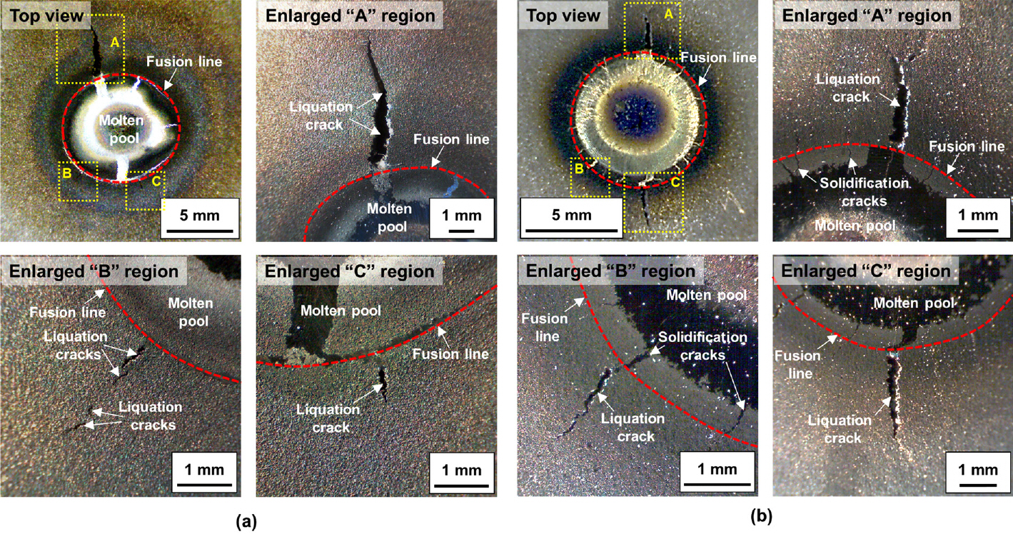 균열, 기공 등의 결함이 확인되지 않았다. 하지만 열영향부 (모식도 상의 “A” 및 “B” 영역)에서는 BSE 사진과 같이 다수의 고온균열이 확인되었다