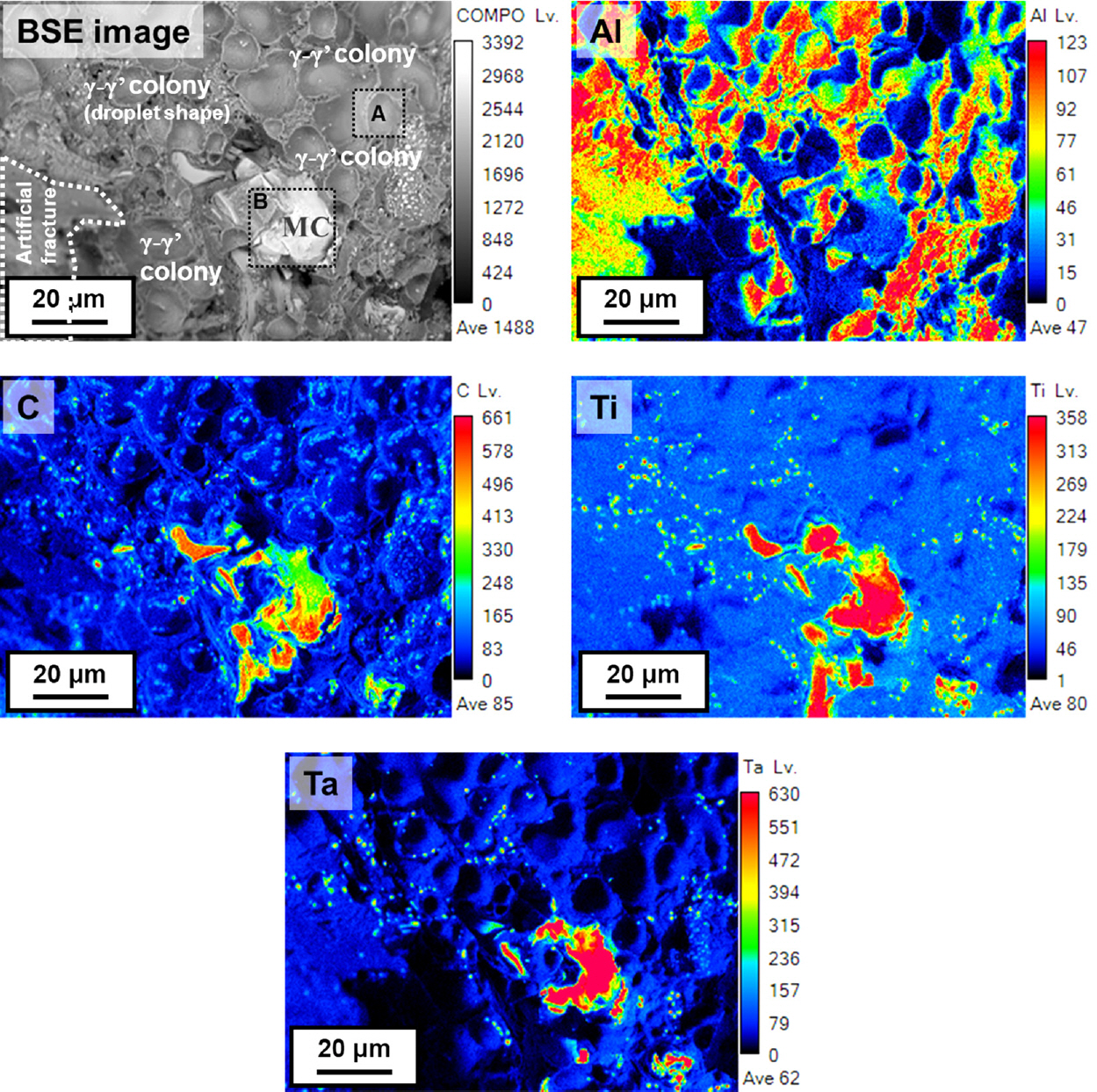 BSE image and element distribution behavior for liquation crack surface at MC region.