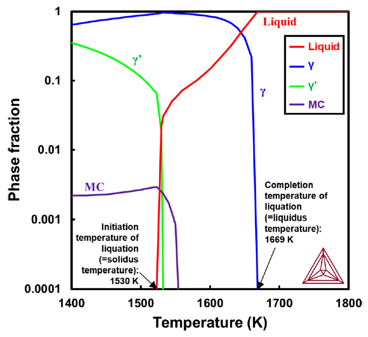 온도)는 CM247LC 합금의 평형상태 액화시작온도(=고상선 온도) 1530 K(1257°C) 보다 낮은 1486 K(1213°C) 로 계산되었다.