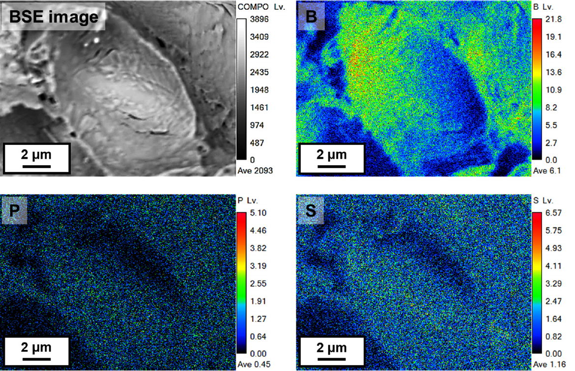 파면 상에서 B 및 불순물 P, S 성분들이 존재하고 있음을 명확히 확인할 수 있고, 이러한 분포는 주조 시의 응고편석 거동과 용접 입열에 의한 열영향부에서의