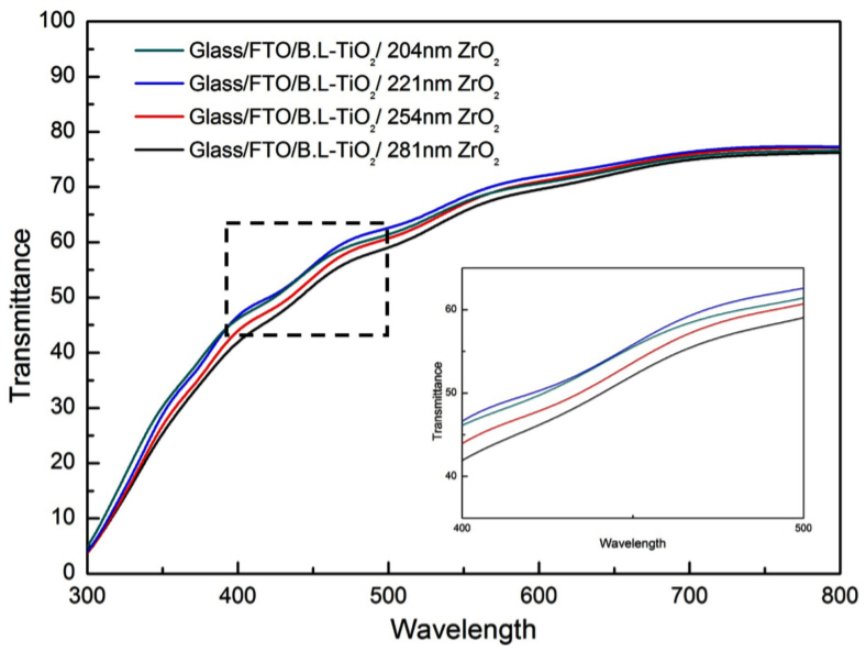 그림 5은 ZrO2 층 두께에 따른 300~800 nm 영역에서의 투과도 분석 결과를 나타내었으며, 우 하단에는 400~500 nm 범위의 투과도를 확대하여 나타내었다.
