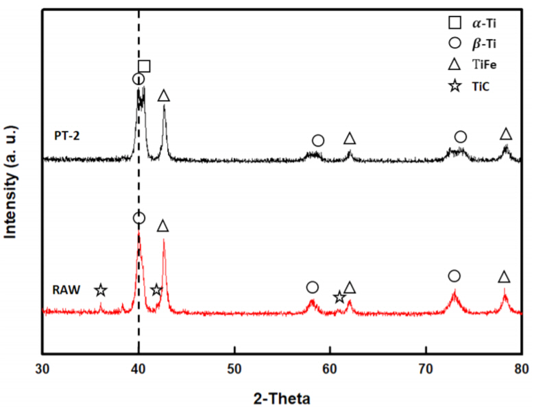 and electrolytic iron at a 7:3 mass ratio. The peaks observed in Fig 5 were mainly β-Ti, α-Ti and TiFe. The XRD peaks of PT-2 were divided into two peaks
