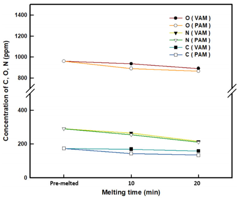 PAM, as a function of melting time. The variations in C, O, and N with the melting