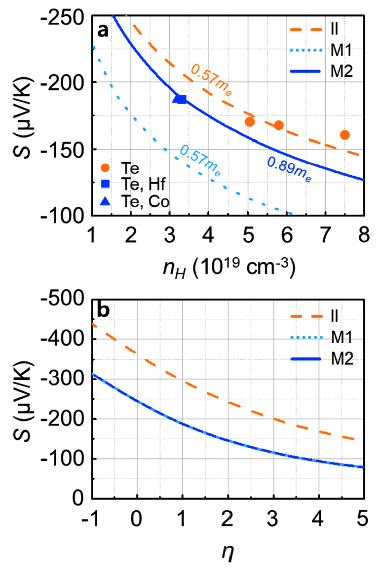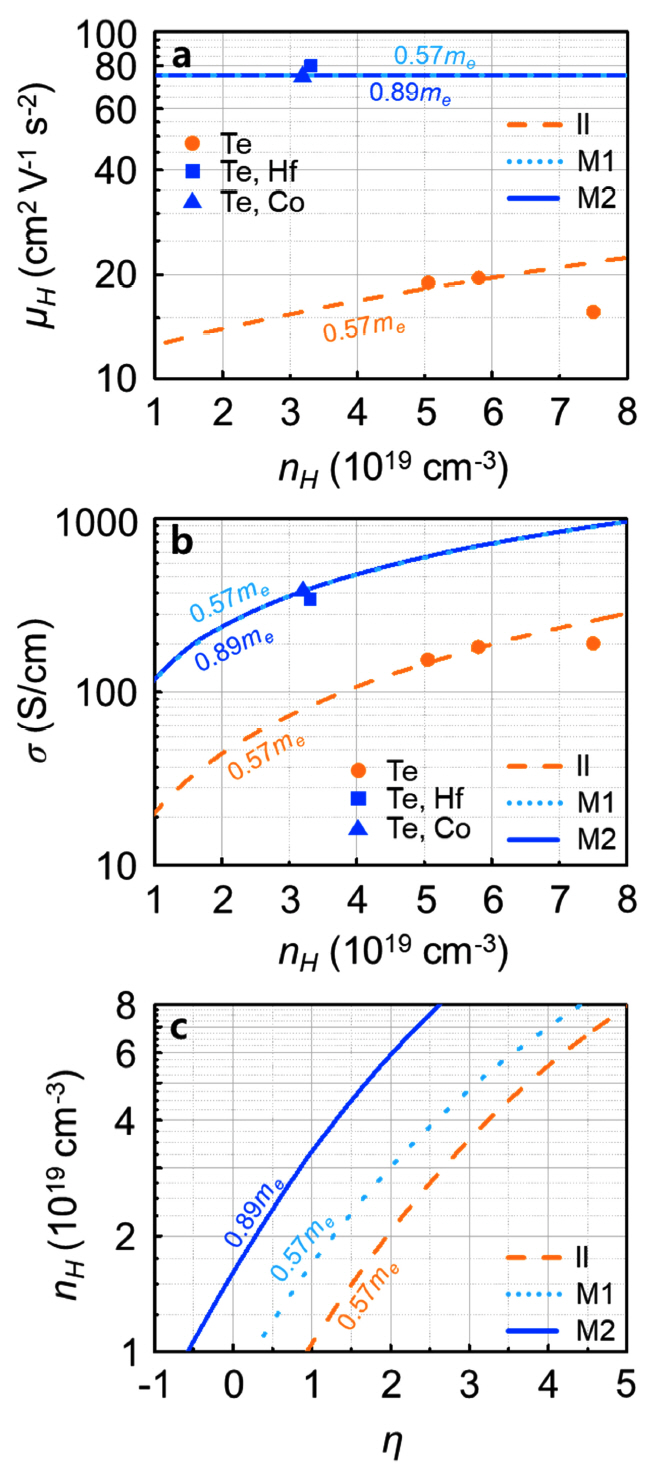 “Te”를 이론적으로 설명하는 “II” (md*= 0.57 me)와 “M1”(md* = 0.57 me)를 비교함으로써 가늠해 볼 수 있다. Te와 전이금속의 동시 도핑을 통해 캐리어 산란 메커니즘과 md*를 동시에 제어할 경우 nH ~ 3 × 1019 (cm-3)에서 약 3.5 배의 파워 팩터 증대 효과가 있지만 (“II”→ “M2”), 캐리어 산란 메커니즘 제어 효과만 고려할 경우, 동일 nH에서 파워 팩터는 약 2배 증대하는 것에 그친다(“II”→ “M1”). 그럼에도 불구하고 단순 캐리어 산란 메커니즘 제어를 통해 약 2배의 파워 팩터