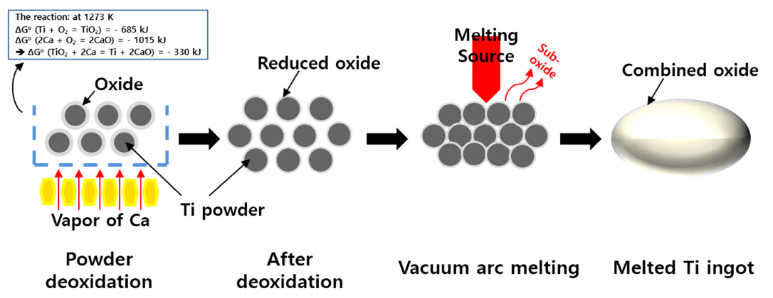 Schematic diagram of deoxidation of titanium powder by using calcium vapor.