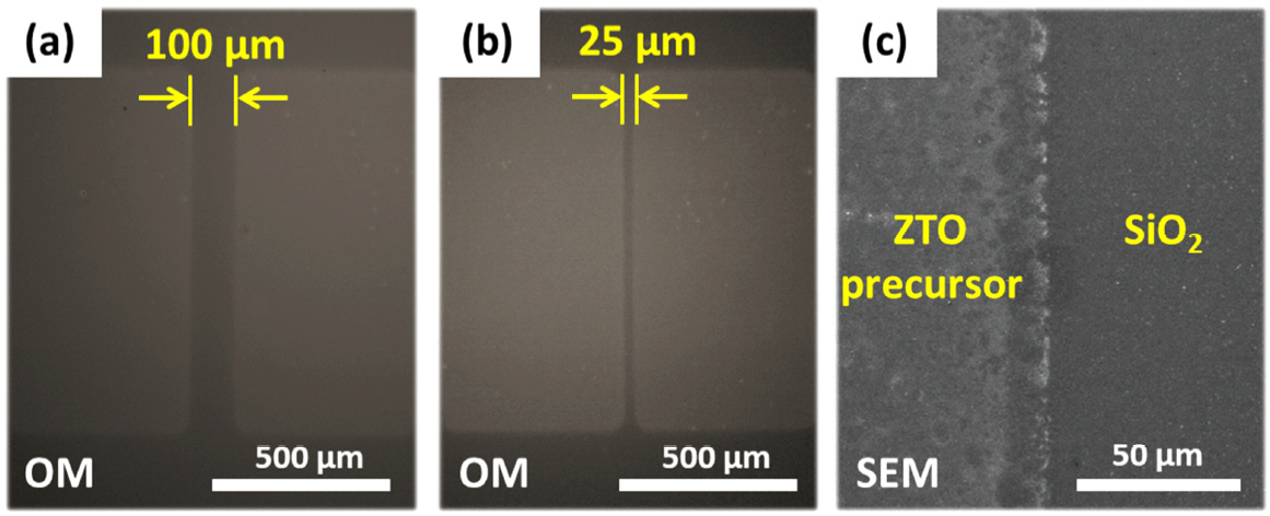 그림 2(a), 2(b)의 OM image를 통해 준비한 용액을 이용하여 ZTO 전구체 박막을 100 μm 간격뿐 아니라 25 μm 간격까지 패턴이 가능한 것을 확인할 수