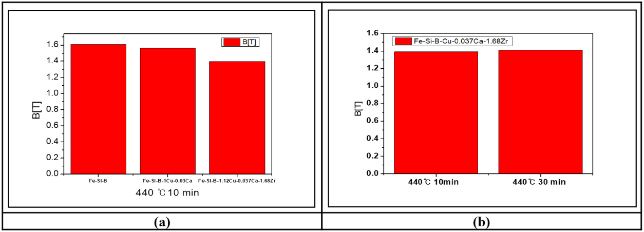 그림 3(a)는 440 °C에서 10분간 열처리한 각 합금리본코어의 포화자속밀도의 차이를 보여주는데, 다른 두 코어에 비하여 Zr가 첨가된 경우에는 Fe의 함량이