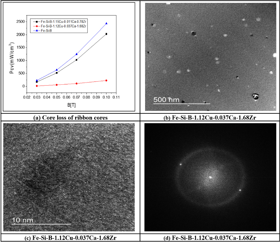 kHz, Bm은 0.03 T, 0.05 T, 0.07 T, 0.1 T 인 조건으로 실험하였다. 표 3에서 자기장을 0.1 T을 걸어 준 코어로스결과를 비교할 경우, Fe-Si-B-1.15Cu-0.011Ca-0.78Zr 리본코어는 2030.2 mW/cm3인 것에 비해 Fe-Si-B-1.12Cu-0.037Ca-1.68Zr 리본코어는 228.413 mW/cm3로 나타나 코아로스값이 상당히 감소한 것을 확인할 수 있다. Fe-Si-B-1.12Cu-0.037Ca-1.68Zr 리본코어와 Fe78-Si9-B13 리본코어의 코어로스(2429.5 mW/cm3)와 비교하면 약 90%정도 감소하는 것을 확인하였고, 또한 Fe-Si-B-1.15Cu-0.011Ca-0.78Zr 리본코어와 비교하면 약 90%로