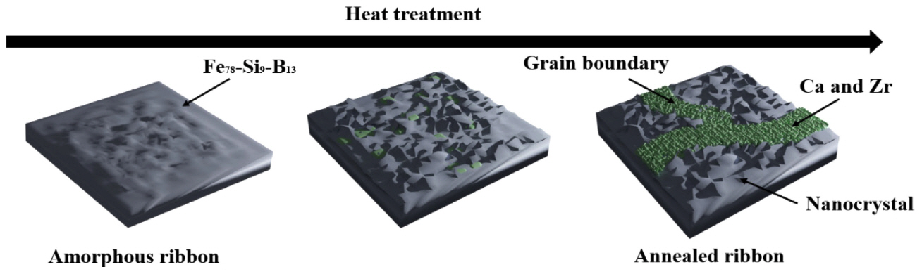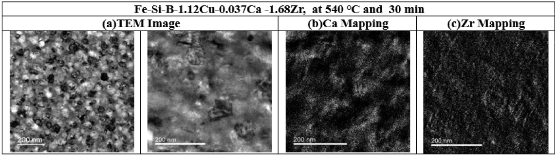한편, 본 연구실의 사전 연구로 발표된 결과 [8]에 의하면, Ca와 Zr이 비교적 많이 첨가된 Fe-Si-B-1Cu-0.19Ca-2.48Zr 합금리본을 540 °C에서 30분간 열처리한 경우가