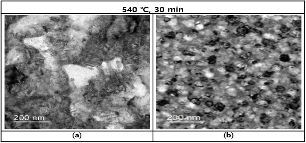 440 °C에서 열처리한 Fe-Si-B-1.12Cu-0.037Ca-1.68Zr의 미세조직의 결정에 비해 540 °C에서 열처리한 Fe-Si-B-1.12Cu-0.037Ca-1.68Zr의
