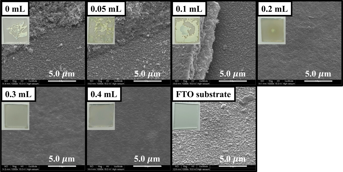0.1, 0.2, 0.3, 0.4 mL의 hydrogen peroxide (H2O2)를 첨가하였고, H2O2 첨가제의 효과를 확인하기 위해 H2O2 첨가제를 첨가하지 않은 침전물 (0 mL)도 함께 제작하였다. 그리고 침전물과 H2O2가 섞인 혼합물은 바이알 믹서기를 이용하여 교반하였다. 제조된 용액은 표면 처리가 된 FTO 기판 위에 떨어뜨리고 스핀 코팅 장비 (Dong Ah