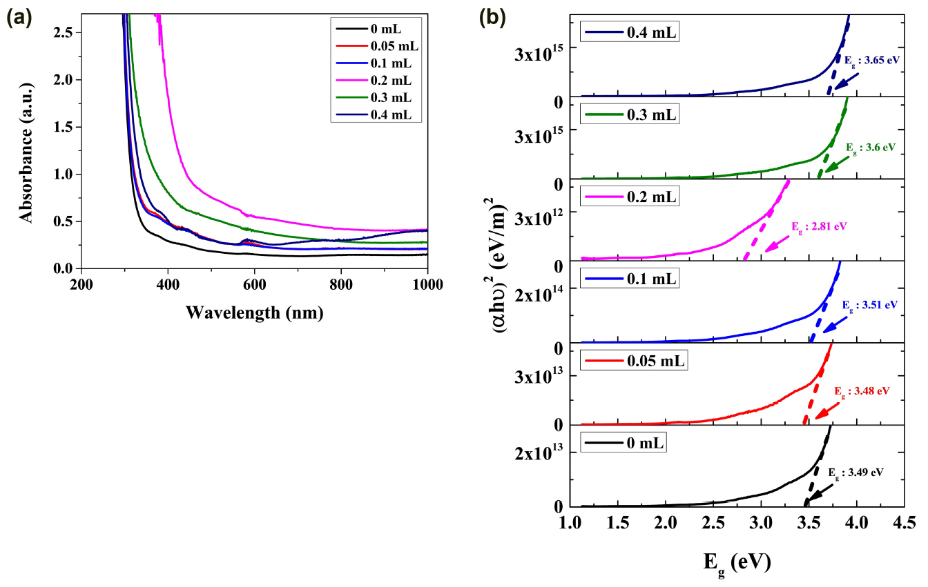 식을 이용하여 계산하였다. 그리고 흡수계수를 사용하여 (αhν)2 vs. Eg 그래프를 그림 3(b)에 나타내었고, (αhν)2 = B(hν-Eg)를 이용하여 구한 광학적 에너지 밴드갭 값을 그래프에 나타내었다(hν : 광자에너지, B : 물질의 고유상수, Eg : 물질의 광학적 에너지 밴드갭). 0, 0.05, 0.1 0.2, 0.3 및 0.4 mL 샘플의 광학적 에너지 밴드갭은 각각 3.49, 3.48,