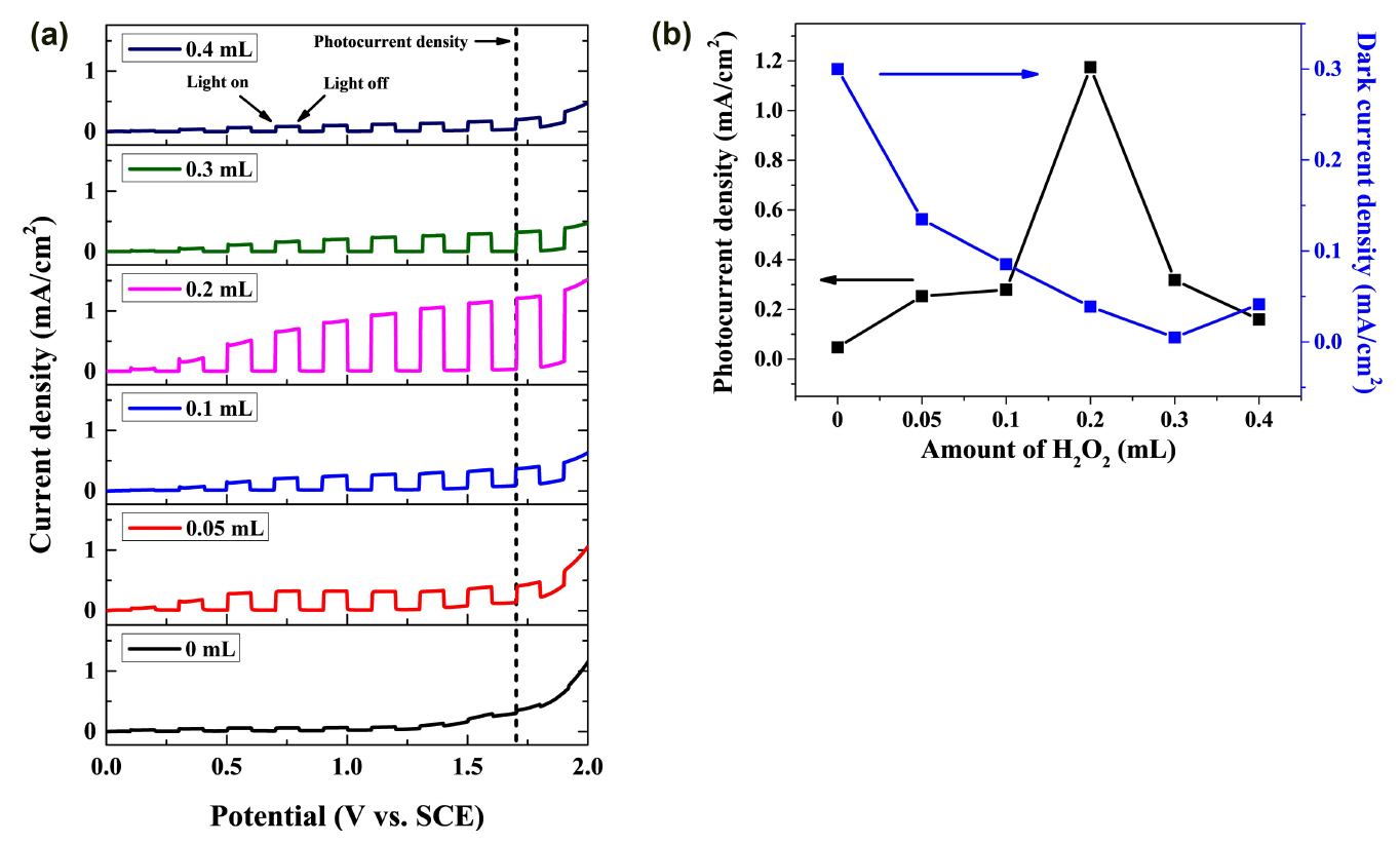 H2O2 양이 증가함에 따라 암전류 밀도 값이 감소하는 경향을 관찰할 수 있는데, 이러한 결과는 광생성된 전자-정공의 재결합 확률 감소와 관련이 있다고 판단된다.