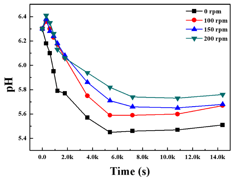 rpm stimulated the generation of OH- ions. An excessively fast rotation rate like 200 rpm, although generating a greater