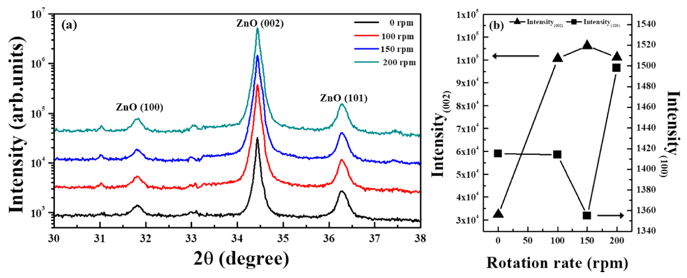 the non-rotating precursor solution. Notably, as shown in Fig 4(b), the intensity of the diffraction peak from the ZnO (002) plane of the ZnO NRs grown
