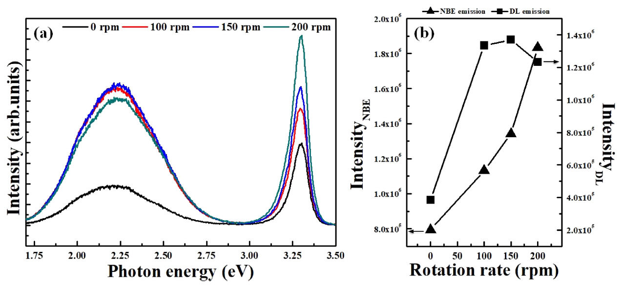 100, 150, and 200 rpm, and Figure 5(b) shows the changes in the intensity of the near-band-edge (NBE) and deep level (DL)