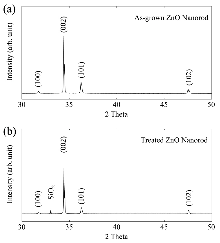 XRD patterns between the asgrown and oxygen-plasma-treated ZnO nanorods. Thus, it