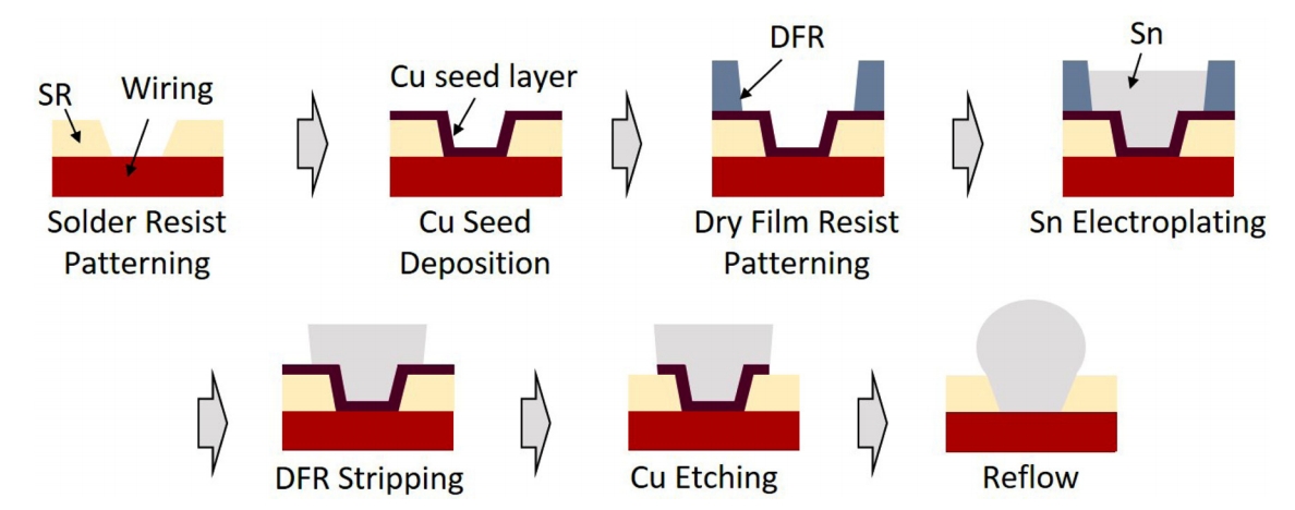 Sn electroplating. After DFR stripping, the bump shape is formed through reflow treatment.