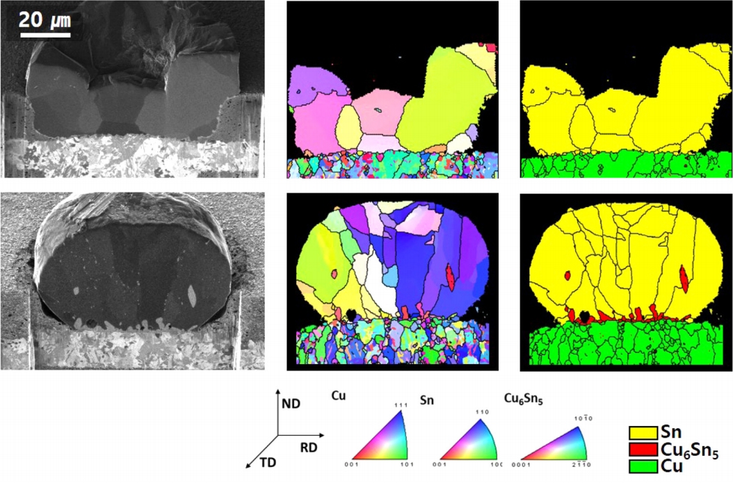 상부 리플로우 후에 형성되는 UBM과 Sn 사이의 금속간 화합물 및 Sn의 결정학적 미세구조 형태에 미치는 영향에 대해서는 향후 관련 연구가 추가로