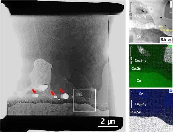 microscopy) 이미지와 EDS(energy-dispersive X-ray spectroscopy)를 통해 Cu/Cu3Sn/Cu6Sn5/Sn 영역을 확인한 결과를 정리하여 나타내었다. 명시야상에서 붉은색 화살표로 나타낸 바와 같이 상당수의 sub-micron 혹은 나노 스케일의 미세한