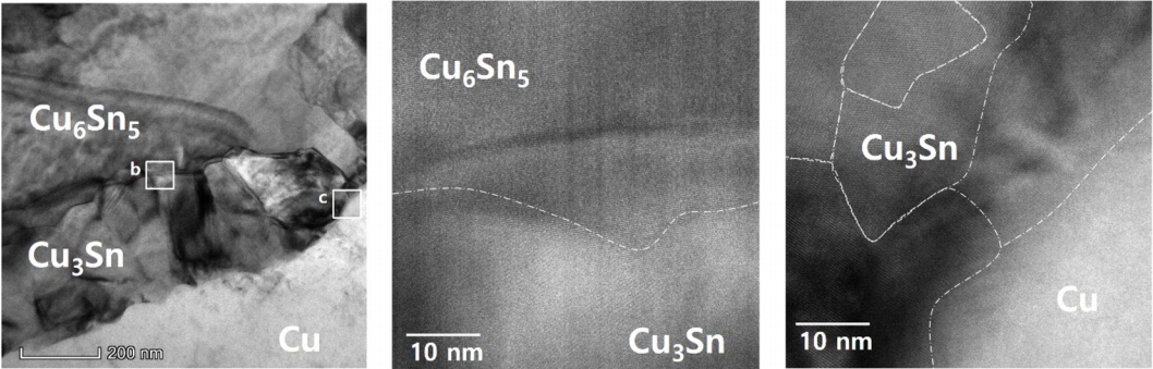 그림 6은 고분해능 TEM 분석을 진행한 결과로 각각 Cu/Cu3Sn 계면과 Cu3Sn/Cu6Sn5을 관찰한 결과를 나타내었다. 두 경계면 모두 특정 방향의 관계를 갖기 보다는 곡면 형태의 경계를 갖는 것으로 나타났는데, 이는 Cu 다결정 구조(polycrystalline
