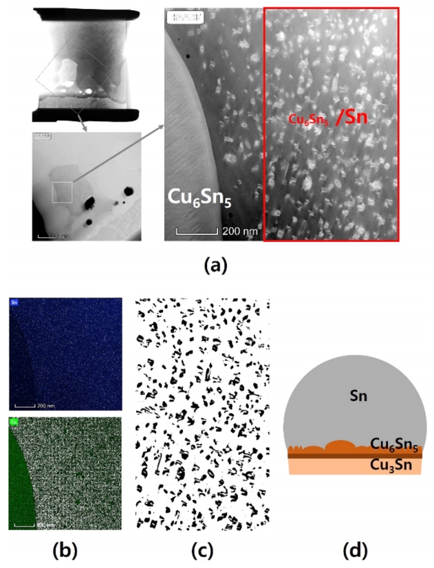 TEM and EDS measurement results of Cu6Sn5 and Sn phases and its image analysis for calculating the phase fraction. (a) Cu6Sn5 phase precipitated by eutectic reaction in Sn phase, (b) EDS mapping results, (c)